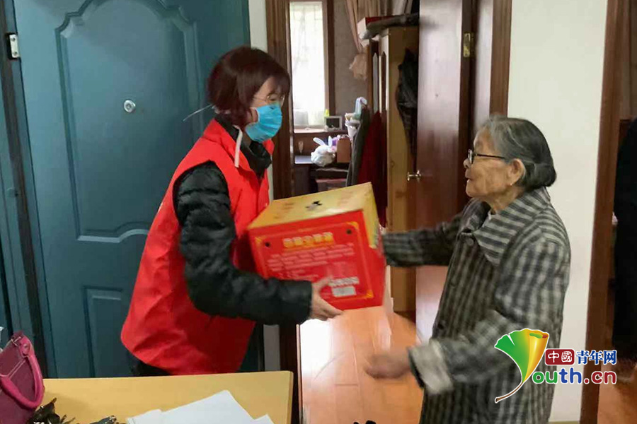 施时雨(左)为不便出门的居民送爱心物品。通讯员供图。