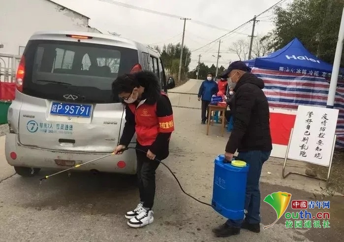 图为舒以颖同学志愿为过往车辆消毒 中国青年网通讯员 樊姝缘摄