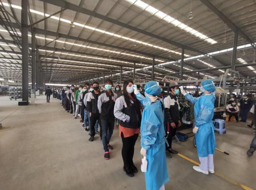毛春懿妈妈(蓝服左一)在工业园区帮工人们测体温