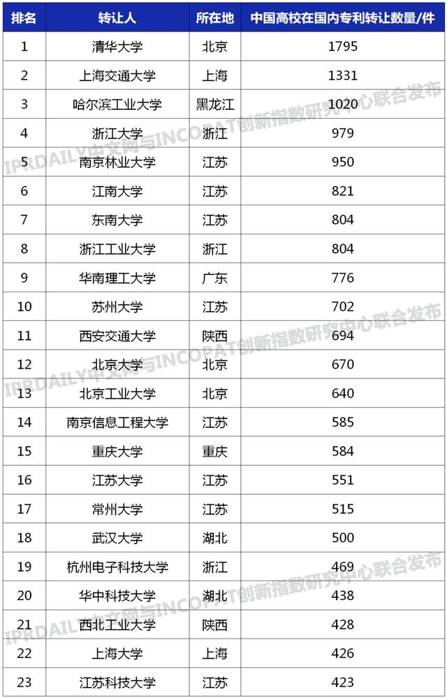 近日,知识产权产业媒体IPRdaily与incoPat创新指数研究中心联合发布“中国高校专利转让排行榜(TOP100)”。榜单对截至2020年02月05日,中国高校在国家知识产权局登记生效的专利申请权/专利权转让数量进行统计排名,榜单显示,我校专利转让累计423件,位列全国高校第23名,江苏高校第8名。