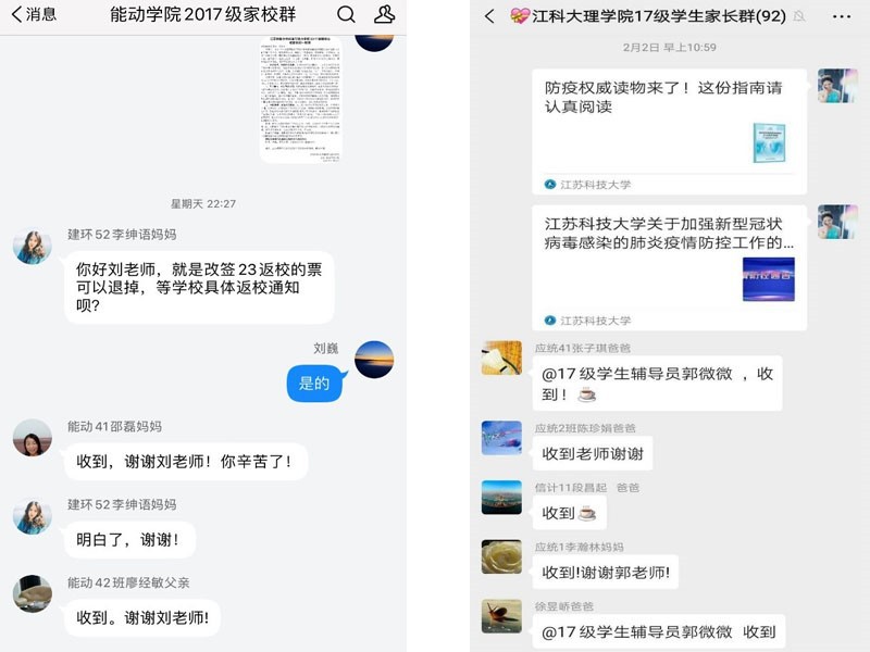 各学院辅导员通过家长QQ群、给家长一封信等方式,及时发布学校公告、权威疫情防控指南等;点对点了解重点疫区学子及其家庭成员的身体状况、居家隔离状况,将学校的关心和牵挂及时传递给他们,并给他们邮寄防疫物资。粮食学院辅导员建立学院运动群,开展“初春运动周”主题活动,号召广大同学加强居家锻炼,每天坚持训练三十分钟,并进行打卡分享。