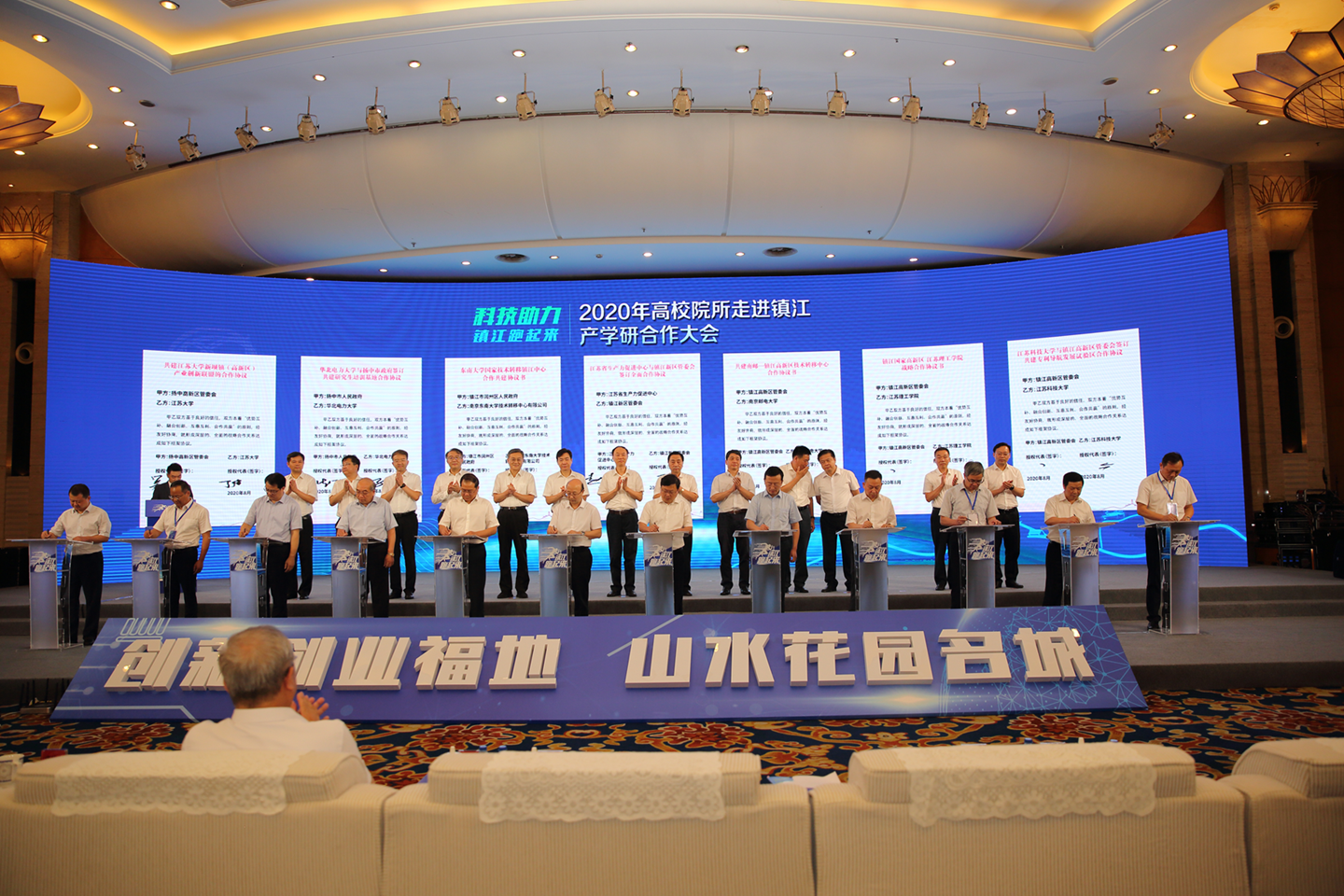 8月5日下午,由江苏省科技厅和镇江市政府共同主办的2020年高校院所走进镇江产学研大会在镇江碧榆园金山厅举行。省政府副省长马秋林出席大会并讲话。我校周南平校长作为特约嘉宾应邀出席大会。俞孟蕻副校长代表我校与镇江高新区签订共建专利导航发展试验区合作协议。学校科技处、相关学院负责人和教师代表十余人参加大会。