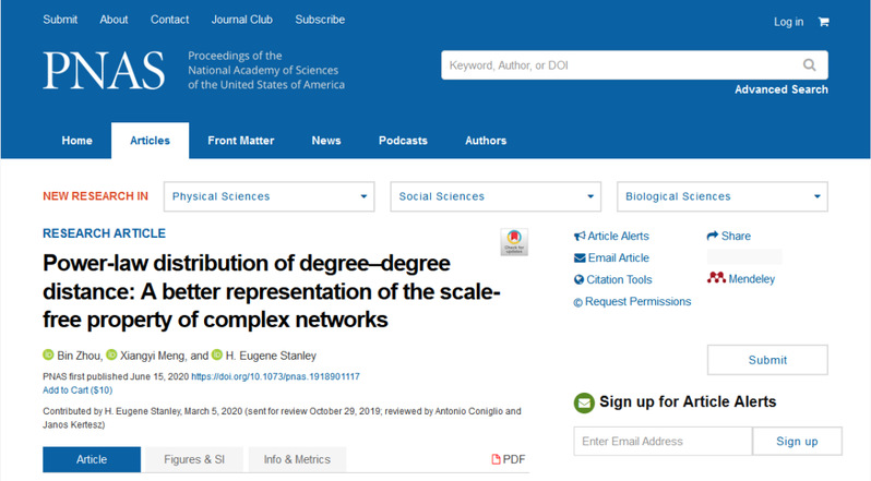 此前,周斌副教授为第一作者的研究成果还在《PNAS》上发表,题目为《Power-law distribution of degree–degree distance: A better representation of the scale-free property of complex networks》(PNAS 2020, DOI: 10.1073/pnas.1918901117),该刊影响因子为9.58(2019),米兰网页版页面登录为论文的第一作者单位。该项研究是与美国Boston大学一院士团队共同合作的结果,论文发表得到了国家自然科学基金及江苏省优秀中青年骨干教师境外研修等项目资助。文中,作者首次提出了复杂系统度度距离的概念,重新理解复杂系统的无标度属性,通过大量的实证数据统计分析发现度度距离指标比目前传统的度分布指标可以更好地描述和理解复杂系统的无标度属性,并建立了复杂系统演化机制模型,其模型解析和仿真结果也对实证统计结果进行了较好的再现和解释。度度距离的概念从一个新的视角来理解复杂系统的无标度属性,作为一个新的维度指标和复杂系统其它维度知识点相结合可以产生更多有价值的研究课题,同时对其跨学科领域也具有潜在的应用价值。