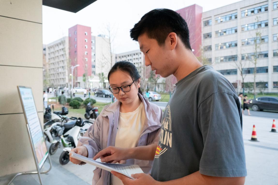 食堂外,00后志愿者们向广大师生发出倡议书,倡导师生做到节约每一粒粮、每一滴水、每一度电,节约每一张纸,使用“公筷公勺”,低碳出行绿色生活,引领节约用餐良好风尚,倡导文明健康生活方式。