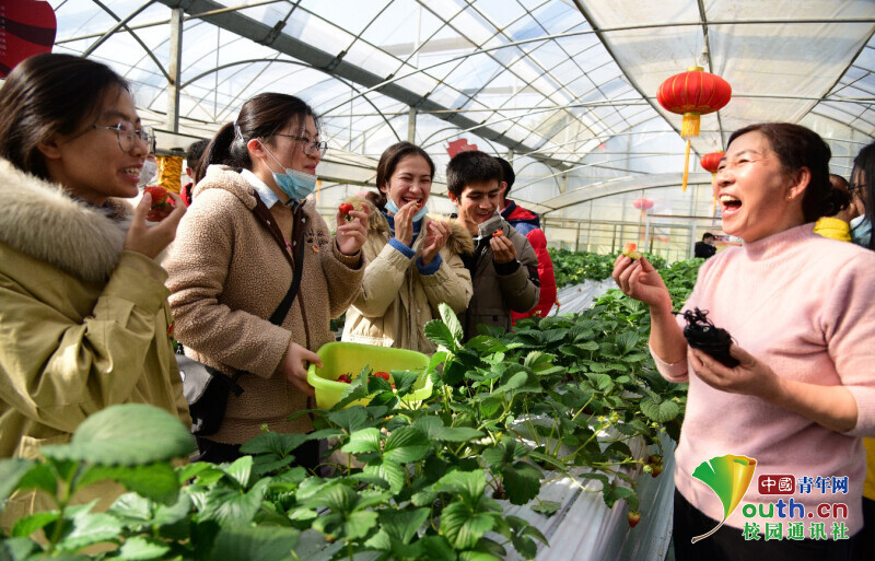 实践团队员们品尝成熟草莓。中国青年网通讯员石玉成摄