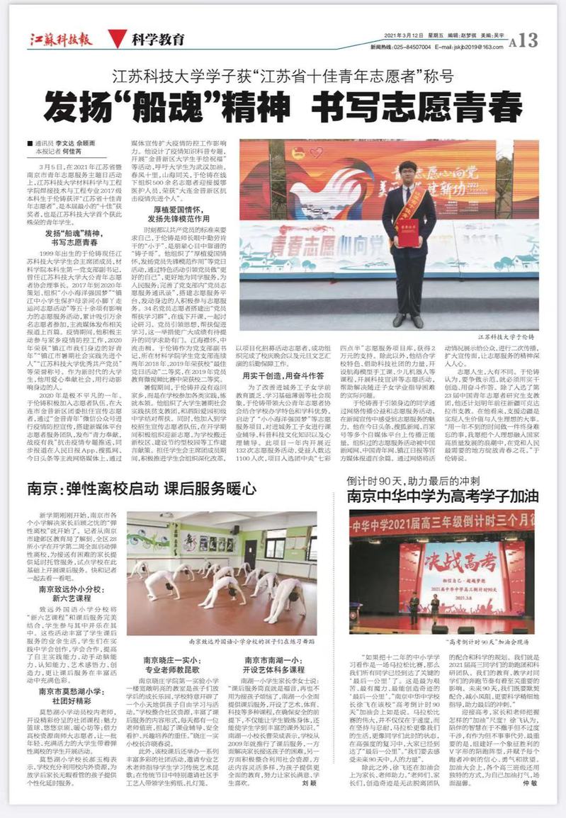 在3月5日2021年江苏省暨南京市青年志愿服务主题日活动上,米兰网页版页面登录材料科学与工程学院焊接技术与工程专业2017级本科生于伦铸获评“江苏省十佳青年志愿者”,是本届“最小”的“十佳”获奖者,也是米兰网页版页面登录首位获此殊荣的青年学生。本次活动由共青团江苏省委、江苏省文明办、江苏省民政厅、江苏省志愿者协会主办,共青团南京市委等单位承办。活动现场表彰了2020年度省十佳青年志愿者和十佳青年志愿服务项目团队等。“十佳青年志愿者”评选分为初选推报、专家复评、候选答辩、综合评定等环节,于伦铸同学从全省264名“优秀青年志愿者”中脱颖而出,经过20强候选答辩后,最终成功当选“十佳”。