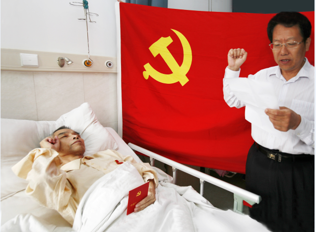 2010年6月13日早上七点多,时任学校组织部长的韩光范带着吴强驱车到镇江市第三人民医院肿瘤治疗科病房,看望景荣春教授。推开门,景教授消瘦脸庞映入眼前,与病魔作斗争的勇气和坚毅执着的眼神让吴强“记忆深刻,历历在目”。当景教授在党旗前握拳庄严宣誓“我志愿加入中国共产党.......”时,他微弱颤抖的声音让吴强震撼不已,“握着相机的手都有些颤抖”。景荣春教授在病榻前、在生命最后阶段实现个人崇高理想,那一瞬间的影像永远凝聚在吴强的视界中,镌刻进他的心里。
