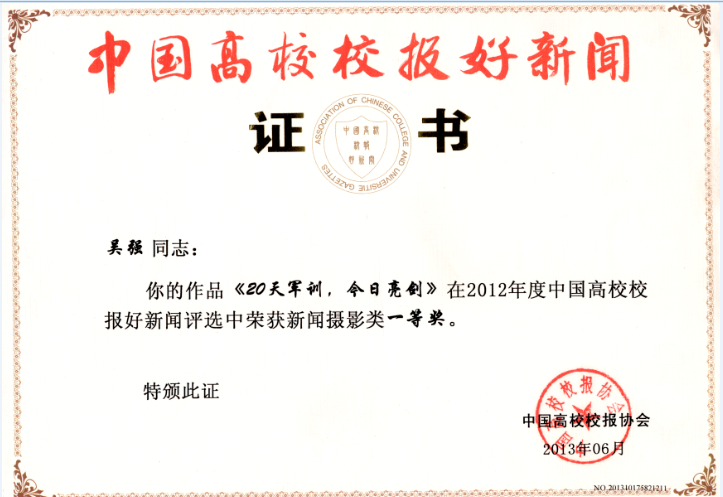 2012年9月28日,东校区军训演练大操场,曾经数次拍摄军训演练的吴强经历了最有“神”的时刻。当天,大学生表演剑术时,腾跃轻盈如燕,刀剑气势如虹。“在我摄影的潜意识里,预感到能出一张精彩的好片子,脑海中已经预设好画面的大致效果。”吴强走到舞剑学生的左侧,相机贴近地面,等待最佳瞬间出现。当学生剑舞腾空的刹那,吴强连拍数张,定格了最美的身姿。画面中生动活泼的舞剑形象很好的表述了大学生英勇果断,敢于亮剑思想主题,这幅作品在年度全国高校好新闻评比中荣获一等奖。