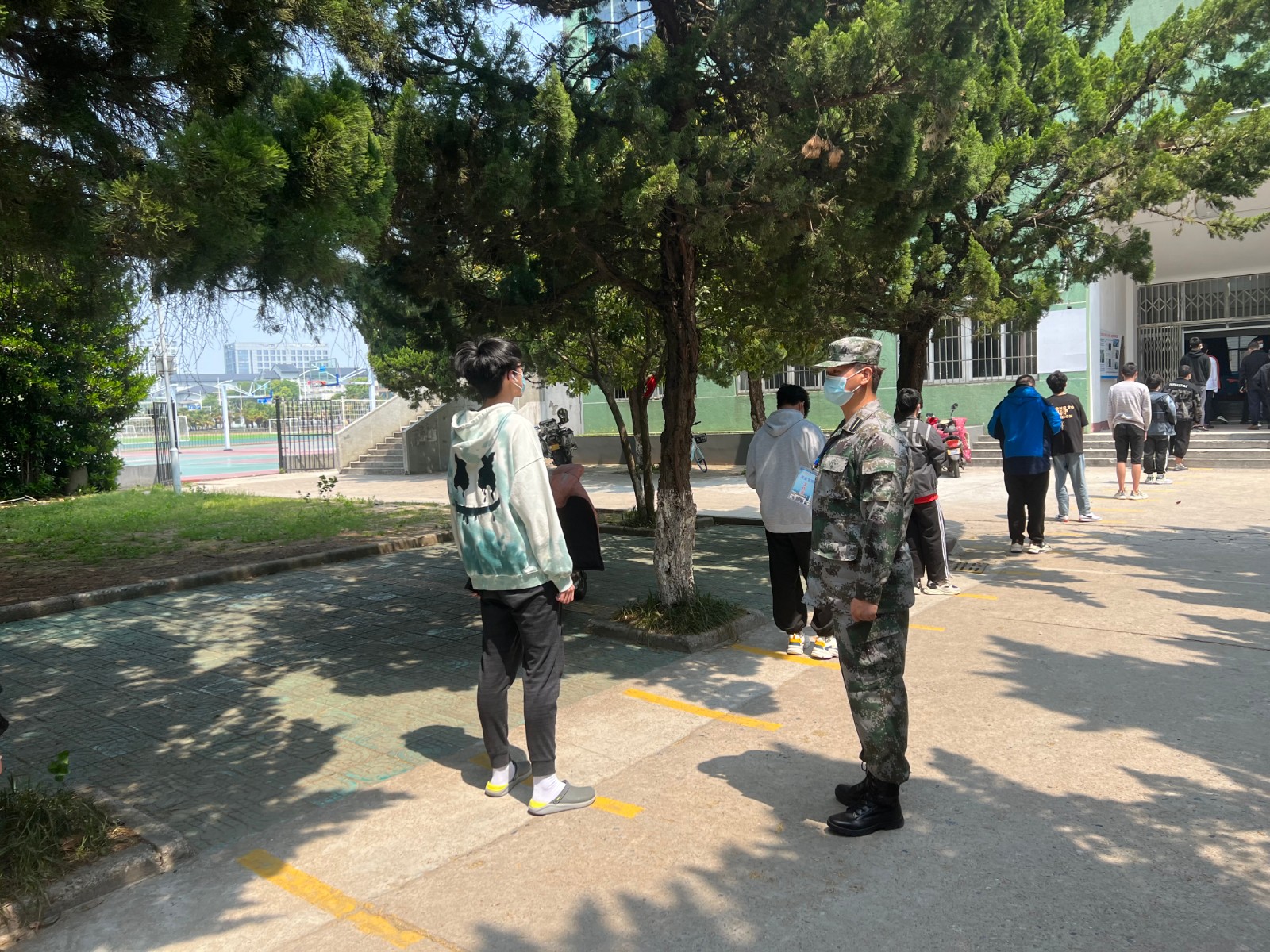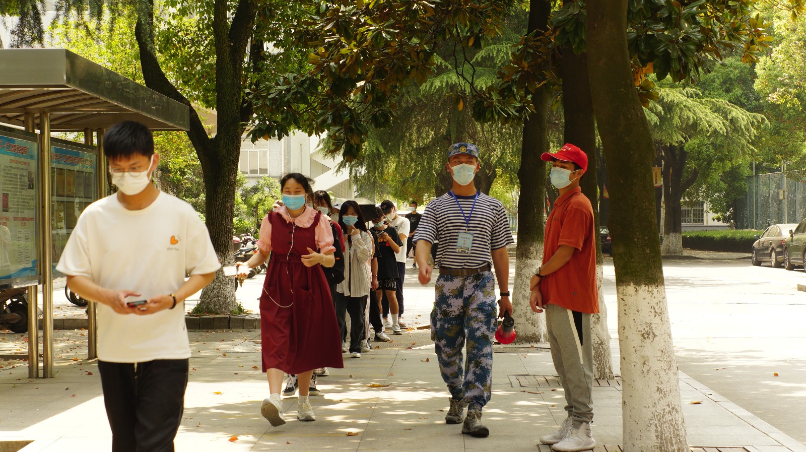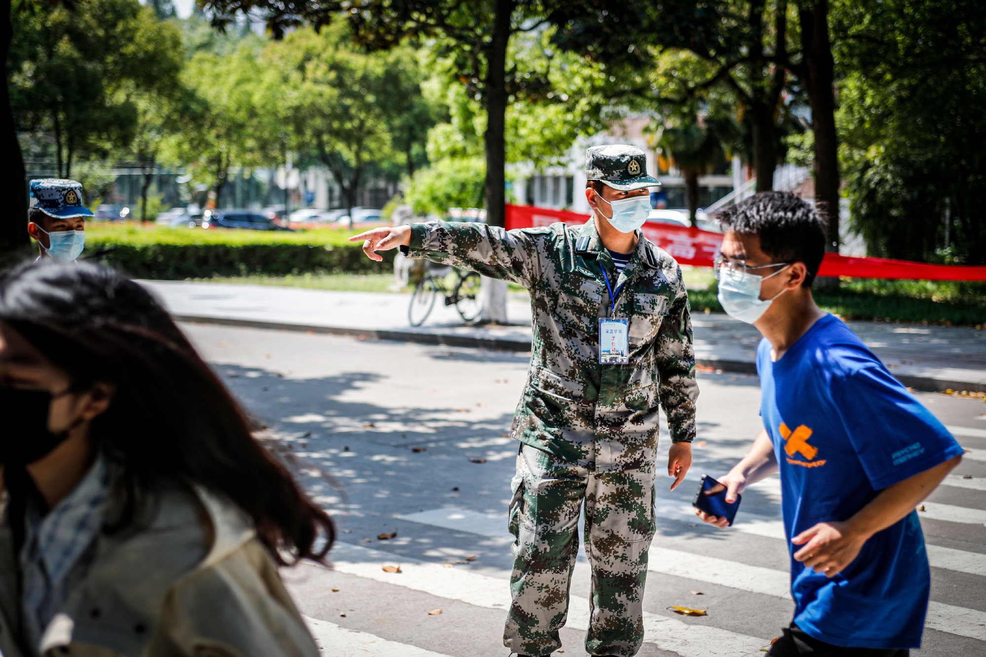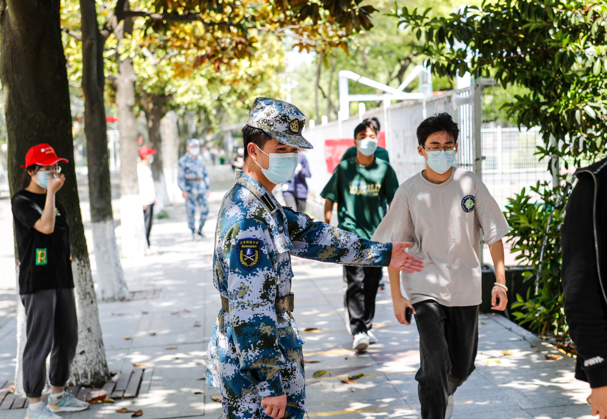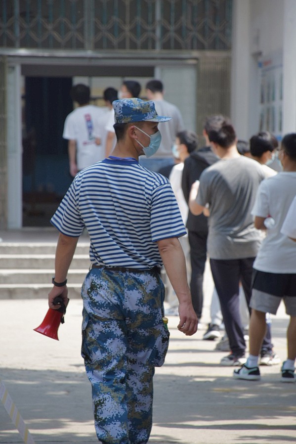 “别跑别跑,走就行了。保持距离,站在线上。”看到前方队伍出现一长段空白,心急的同学忍不住跑步向前,肖芸树当即双手握拳收缩在侧大步流星追上,同时稳定发声安抚情绪。曾经服役于武警某部的他,做过特种作战狙击手,作风沉稳刚劲。陈健和吴振坤介绍,每天大家重复最多的话是“戴好口罩,保持2米距离”“请准备好身份证,谢谢大家的配合。”看似简短,实则经过队员们不断打磨。