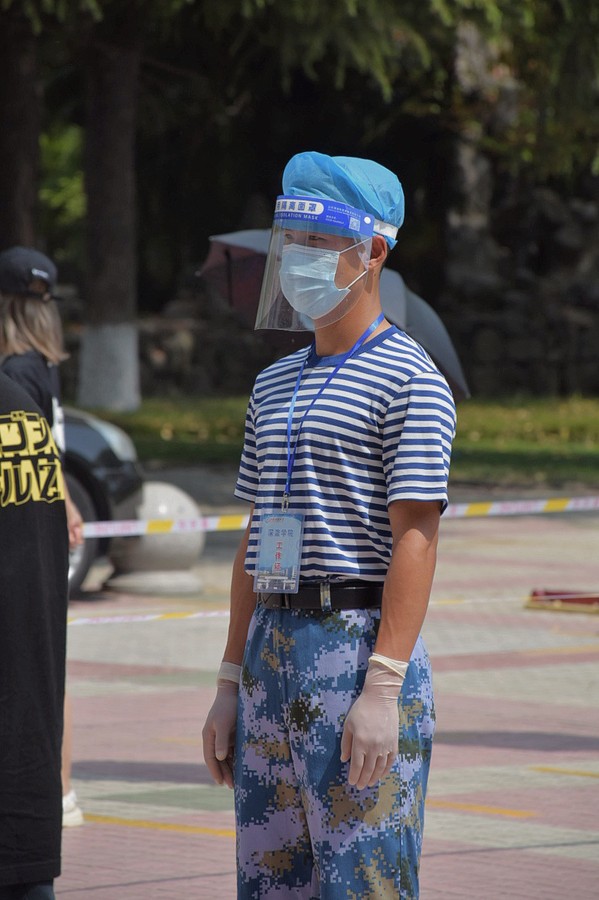 第一轮全员核酸检测时,朱森淼第一次穿上了防护服,成了一名全副武装的“大蓝”。那天室外温度超过25℃,汗水蒸发让朱森淼的面罩起了一层雾,“都没办法看清。从迷彩到大蓝,责任是一样的,同样是在一线为大家服务。我会把每一次执勤都当做特别的任务对待。”小组成员王俊才告诉记者,“全员核酸的时候站立要达到6个小时以上,特别辛苦也特别累,但是想一想能为学校出一份力,又会把腰杆挺得更直。”
