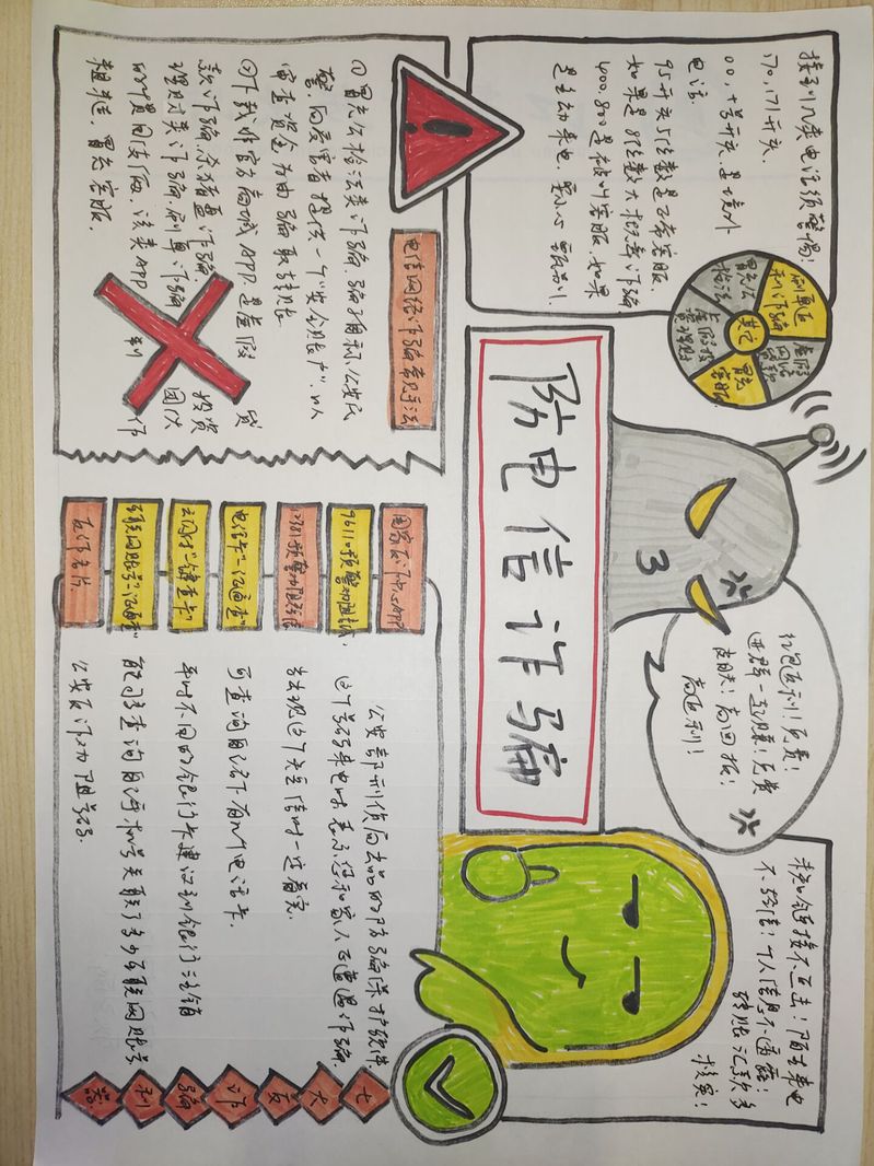 防诈骗海报以“你我同心·防诈同行”为主题,围绕冒充公检法、购物退款诈骗、贷款诈骗、兼职刷单和冒充熟人诈骗等内容展开。本次活动以海报、手抄报、创意画设计的形式提醒广大同学警惕各类诈骗形式和诈骗手段,在潜移默化中有效地宣传了校园防诈知识,营造了全校共同参与防诈宣传的浓厚氛围。