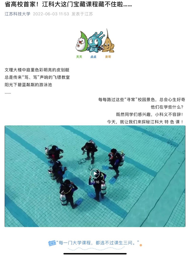《省高校首家!江米兰网页版页面登录这门宝藏课程藏不住啦……》一文由我校大学生通讯社记者采写,以视频、图片、文字相融合的方式报道了学校开设的特色潜水课程,语言生动、主题突出,内容丰富、形式新颖,兼具新闻的重要性和趣味性。