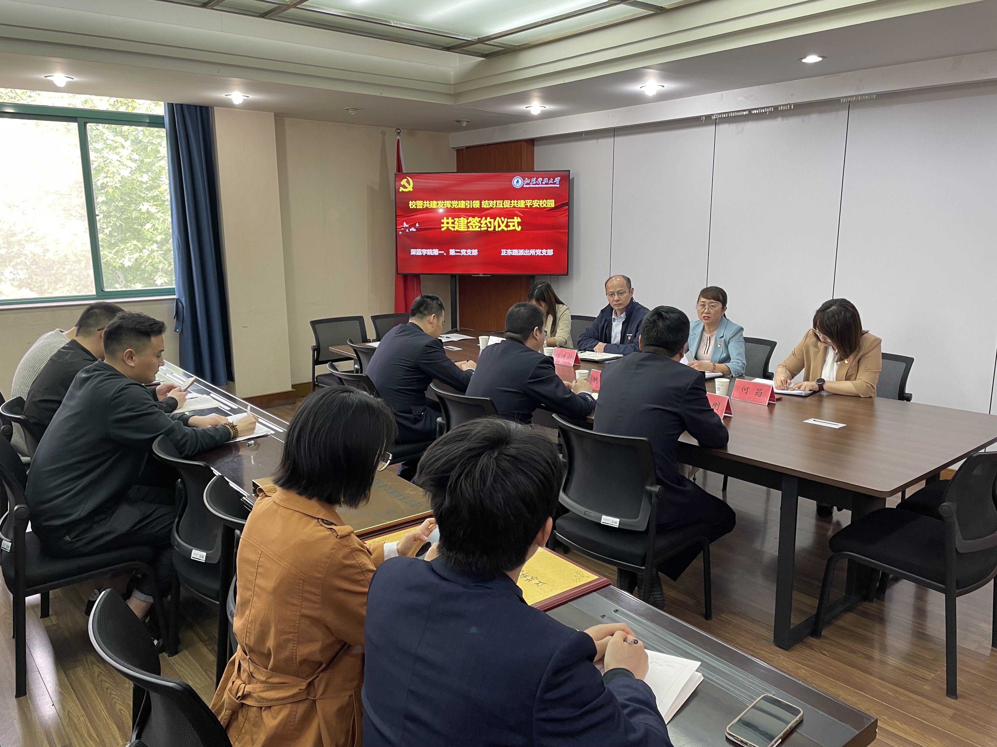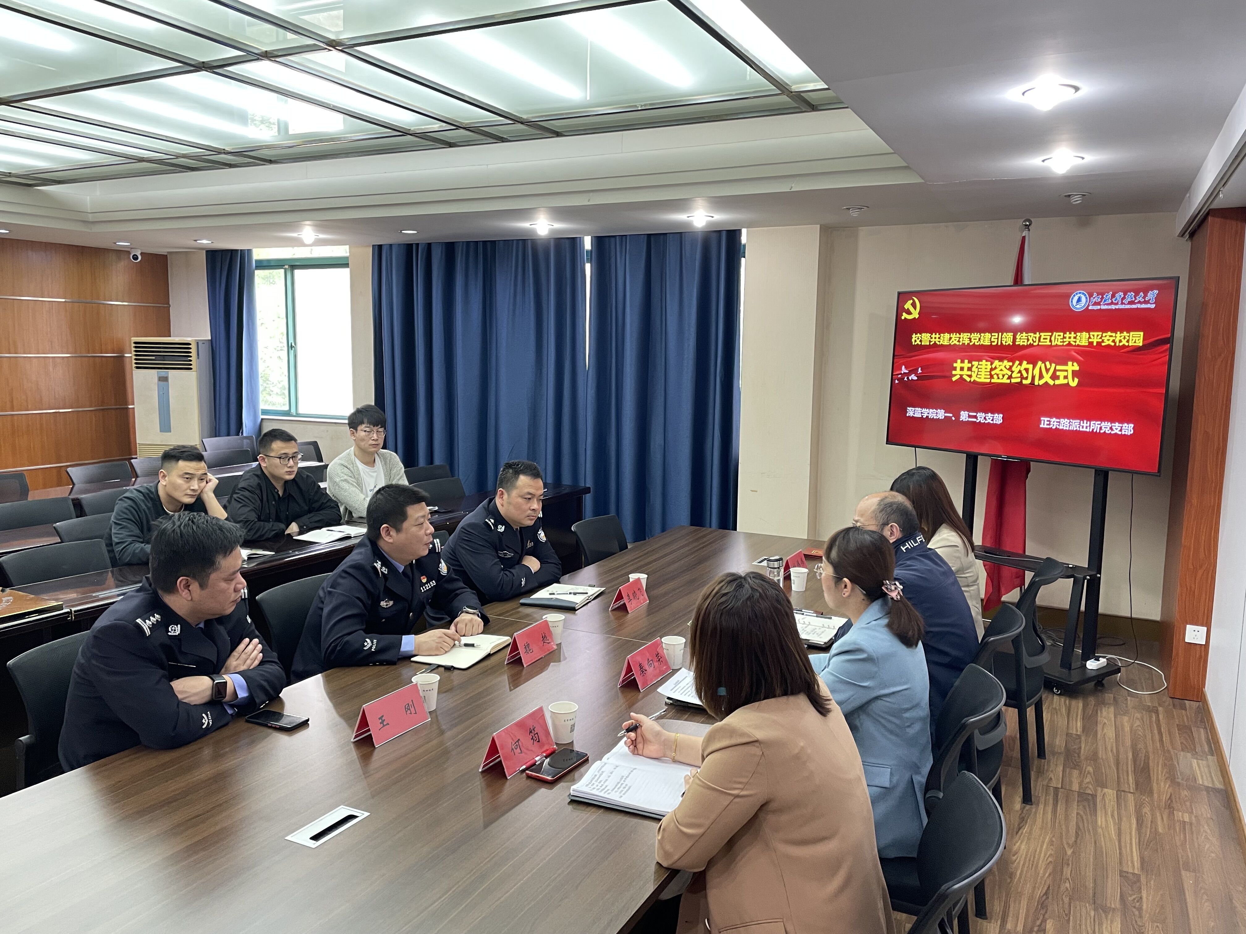 为进一步发挥党建引领作用,筑牢校园安全屏障,强化基层服务型党的组织建设,探索加强组织联建、资源共享的有效途径,4月28日上午,深蓝学院第一、第二党支部与镇江市公安局京口分局正东路派出所党支部在深蓝学院301会议室举行结对共建签约仪式。仪式由深蓝学院党总支副书记秦向荣主持。镇江市公安局京口分局正东路派出所党支部书记兼所长魏越、党支部副书记兼教导员李晓飞、江米兰网页版页面登录社区民警王刚,深蓝学院党总支书记、院长杨建超、第一党支部书记杜伟伟、第二党支部书记何筠及第一、二党支部全体支委参加了此次活动。