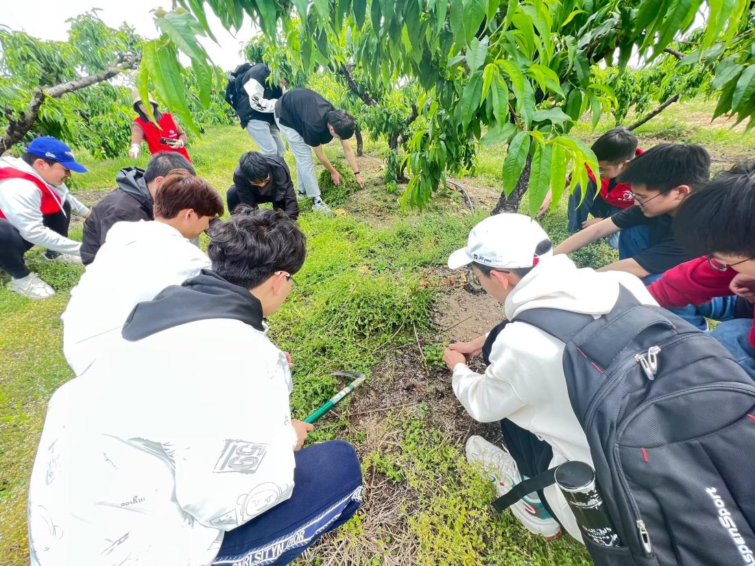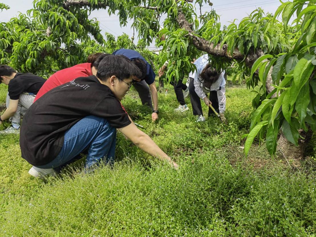 除草环节中,果园负责人向同学们讲解了辨别杂草的方法,并耐心答疑解惑。“授课”结束后,同学们各个摩拳擦掌,有的拿镰刀割草,有的拿锄头锄草,虽骄阳似火、烈日炎炎,但大家没有嬉闹、没有抱怨,反而用汗水助力了“尚香黄桃”的成长。同时,也体会到了“谁知盘中餐,粒粒皆辛苦”“一分耕耘一分收获”的深刻内涵。