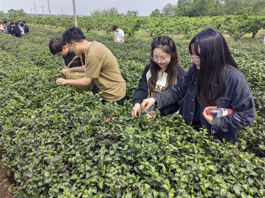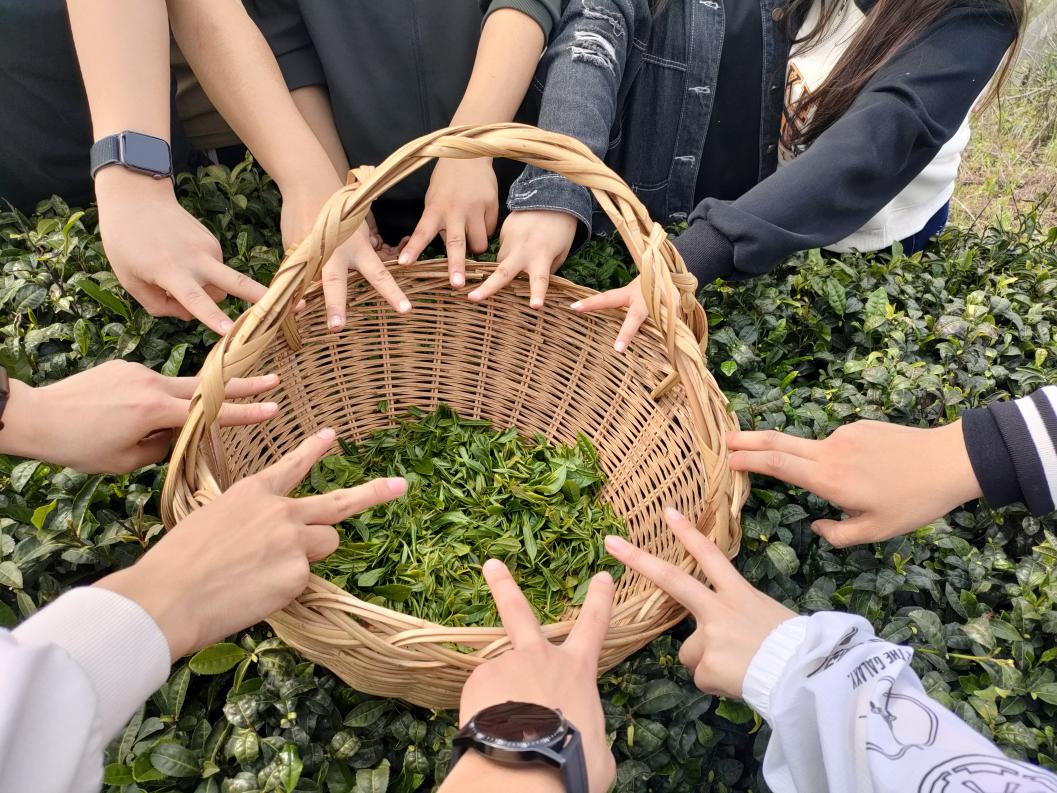 采茶环节中,同学们跻身绿意盎然的茶园中,认真学习茶农们采摘茶叶的“秘诀”。采茶时,同学们穿梭在茶树间,谨记茶农教授的“一芽一叶”,专心致志地寻找合适的嫩芽,小心翼翼地“掐尖”后放进茶篮,又不厌其烦地找寻下一片翠绿。同学们也在这种新奇有趣的重复中,深切体会到了农民伯伯的不易和志愿活动的意义所在,同时,也对中国的茶文化有了更深层次的理解。
