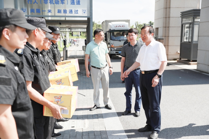 在学校南门,周南平校长一行给保安人员送去解暑饮料,对大家在酷暑中顶着烈日守护学校安全表示感谢,希望他们在做好保卫工作的同时,也要做好自身的降温防暑。在图书馆监控中心,周南平校长一行了解了全校的视频监控情况,希望安保处加强管理,特别是要关注恶劣天气,做好研判预判,加强联动,做好危险路段的安全警示和改造,不断提升学校整体安防水平。