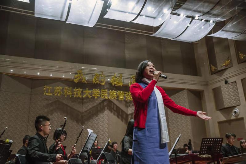2019年,庆祝中华人民共和国成立70周年,大艺团民乐团在西津渡音乐厅举办“我的祖国”民族管弦乐音乐会,迈出将高雅艺术从校园传播至社会的第一步。陈欢与同学们既是演员也是场务,不分日夜排练演出,齐心协力搬运乐器。陈欢动容地说:“民乐合奏是集体的艺术,同学们的团结默契不仅在台前更在幕后,我想这也是艺术教育的力量。”在这场音乐会上,陈欢也从幕后走到台前,演唱歌剧《江姐》选段《绣红旗》。退居幕后多年的她激动地“怦怦心跳”,借着歌声娓娓诉说,深情演绎了江姐坚贞不渝、顽强不屈的高尚气节和坚信革命必胜的信心。
