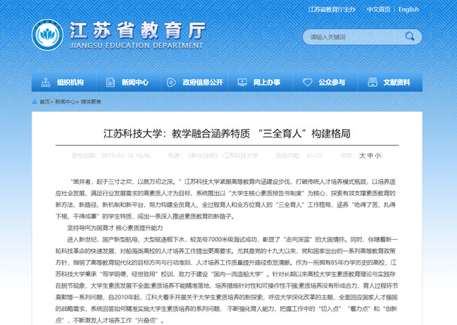 江苏省教育厅《米兰网页版页面登录教学融合涵养特质 “三全育人”构建格局》(2019年3月18日)