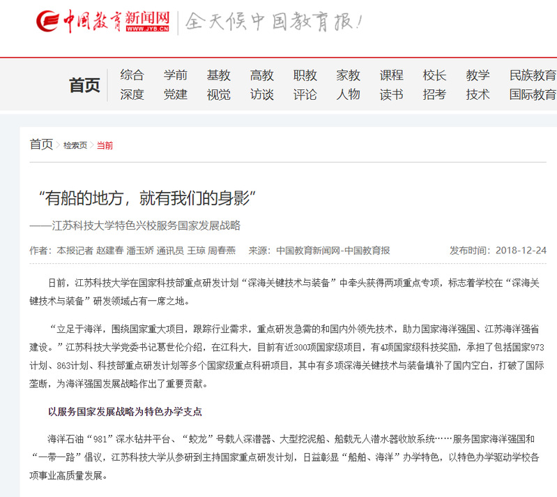 中国教育新闻网《“有船的地方,就有我们的身影”——米兰网页版页面登录特色兴校服务国家发展战略》(2018年12月24日)
