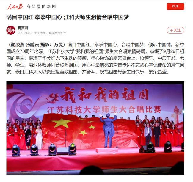 人民日报《满目中国红 拳拳中国心 江米兰网页版页面登录师生激情合唱中国梦》(2019年9月30日)