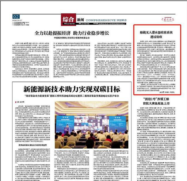 中国船舶报《船载无人潜水器收放系统通过验收》(2022年9月7日)