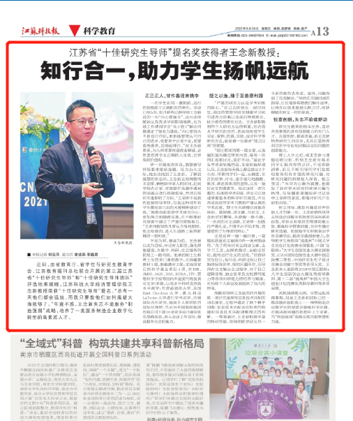 江苏科技报《江苏省“十佳研究生导师”提名奖获得者王念新教授:知行合一,助力学生扬帆远航》(2022年9月30日)