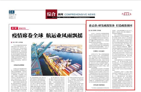 中国船舶报《俞孟蕻:研发疏浚装备 打造疏浚强国》(2020年4月10日)