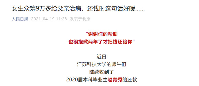 人民日报《女生众筹9万多给父亲治病,还钱时这句话好暖》(2021年4月19日)
