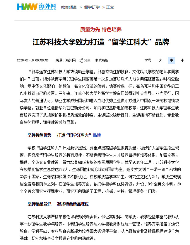 人民日报(海外网)《米兰网页版页面登录致力打造“留学江米兰网页版页面登录”品牌》(2020年1月10日)