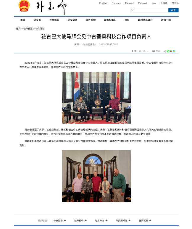 外交部《驻古巴大使马辉会见中古蚕桑科技合作项目负责人》(2023年5月17日)