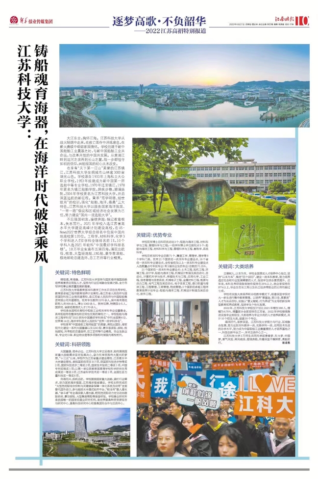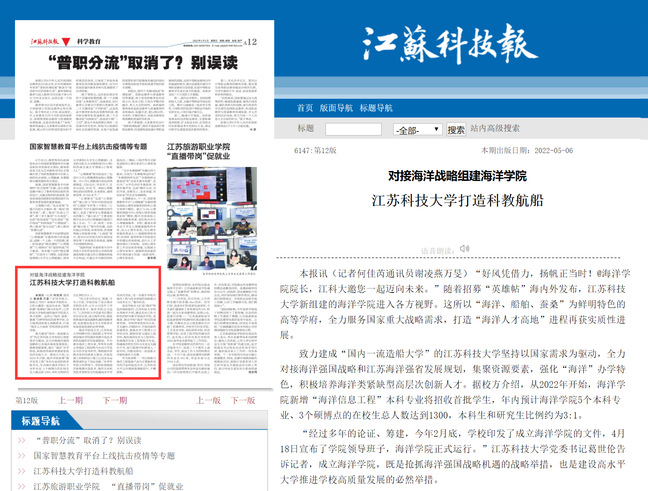 江苏科技报《对接海洋战略组建海洋学院 米兰网页版页面登录打造科教航船》(2022年5月6日)