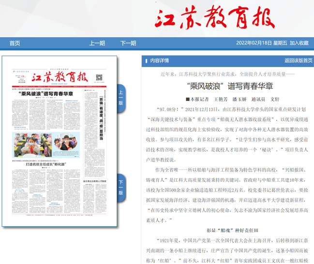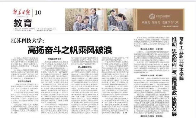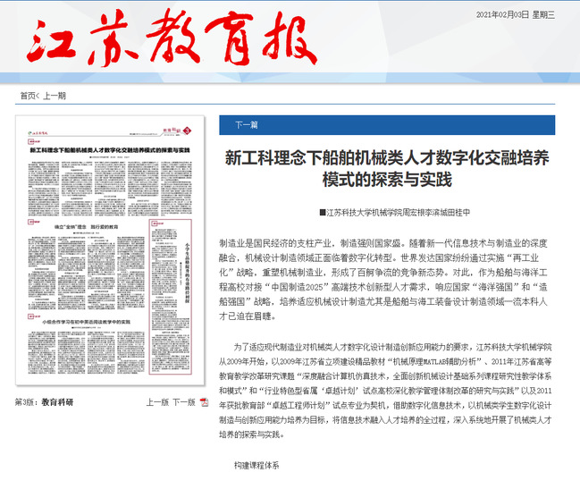 江苏教育报《新工科理念下船舶机械类人才数字化交融培养模式的探索与实践》(2021年2月3日)