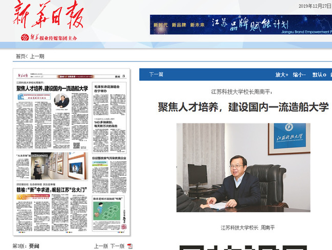 新华日报《米兰网页版页面登录校长周南平:聚焦人才培养,建设国内一流造船大学》(2019年12月27日)