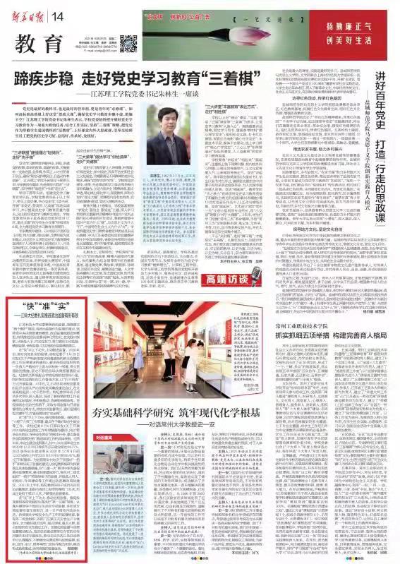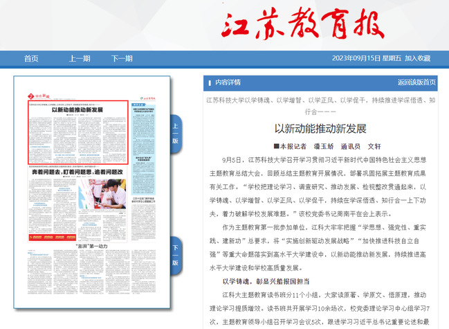 江苏教育报《米兰网页版页面登录以学铸魂、以学增智、以学正风、以学促干,持续推进学深悟透、知行合一——以新动能推动新发展》(2023年9月15日)