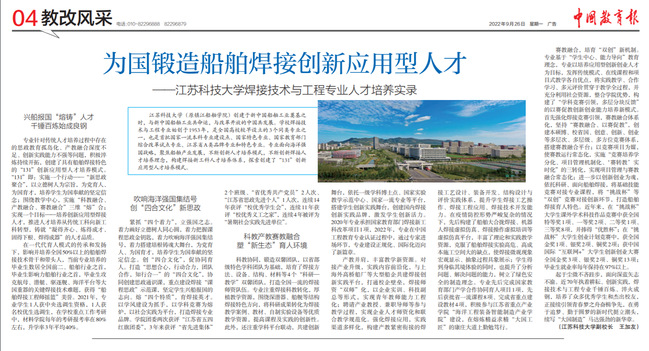 中国教育报《为国锻造船舶焊接创新应用型人才——米兰网页版页面登录焊接技术与工程专业人才培养实录》(2022年9月26日)