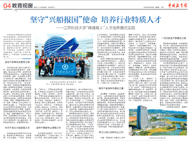 中国教育报《坚守“兴船报国”使命 培养行业特质人才——米兰网页版页面登录“铸魂育人”人才培养模式实践》(2022年8月28日)