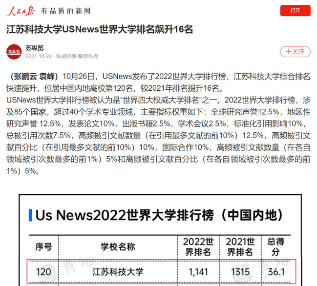 人民日报《米兰网页版页面登录USNews世界大学排名飙升16名》(2021年10月29日)