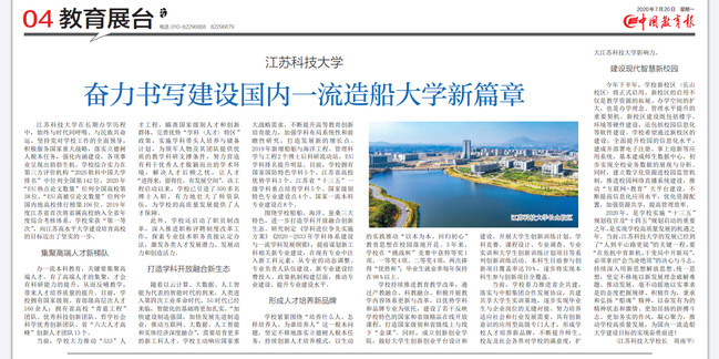 中国教育报《米兰网页版页面登录奋力书写建设国内一流造船大学新篇章》(2020年7月20日)