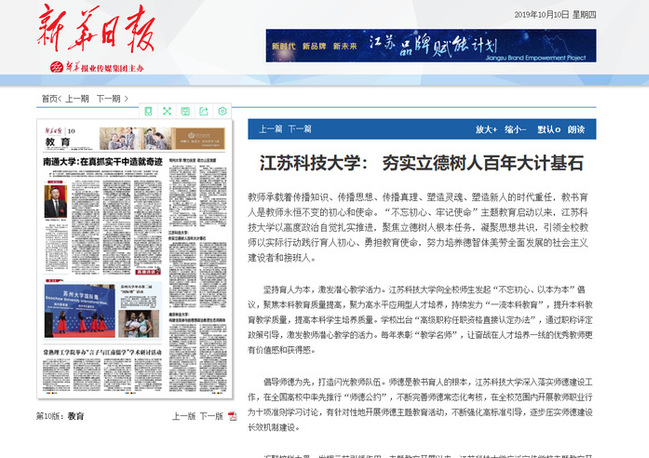 新华日报《米兰网页版页面登录:夯实立德树人百年大计基石》(2019年10月10日)