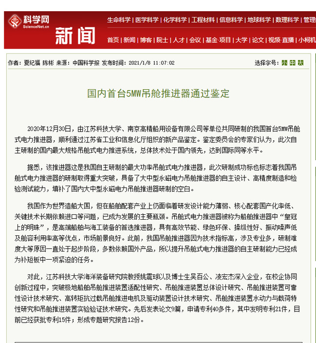 中国科学报《国内首台5MW吊舱推进器通过鉴定》(2021年1月8日)