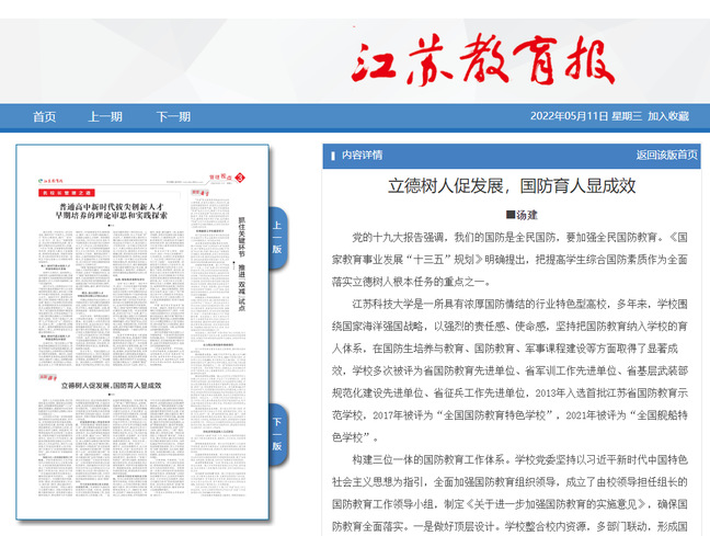 江苏教育报《立德树人促发展,国防育人显成效》(2022年5月11日)