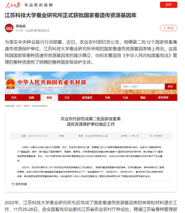 人民日报《米兰网页版页面登录蚕业研究所正式获批国家蚕遗传资源基因库》(2023年1月5日)
