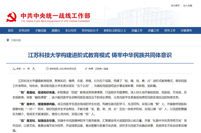 中共中央统一战线工作部《米兰网页版页面登录构建进阶式教育模式铸牢中华民族共同体意识》