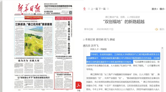 新华日报《镇江推动产业、创新、人才相互促进 “双创福地”的新路超越》(2022年8月17日)
