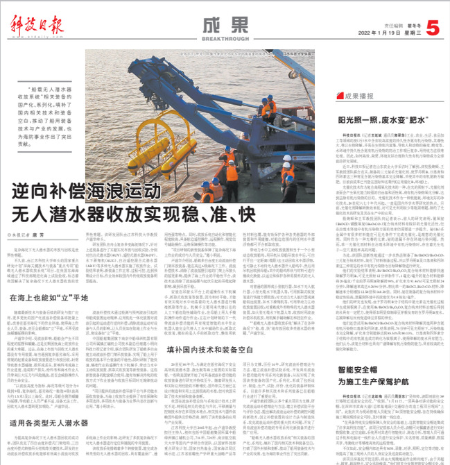 科技日报《逆向补偿海浪运动 无人潜水器收放实现稳、准、快》(2022年1月19日)