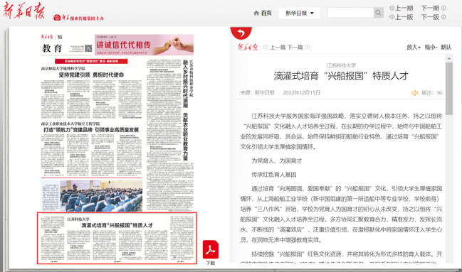 新华日报《米兰网页版页面登录滴灌式培育“兴船报国”特质人才》(2022年12月15日)
