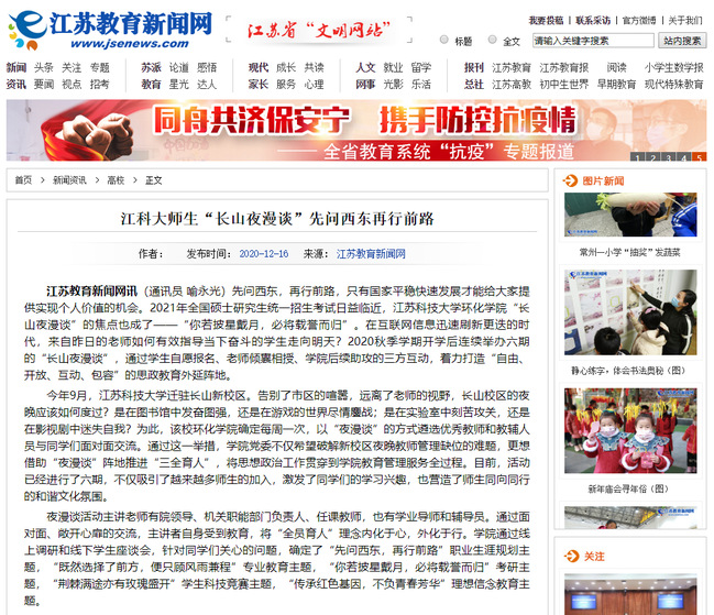 江苏教育新闻网《江米兰网页版页面登录师生“长山夜漫谈”先问西东再行前路》(2020年12月16日)