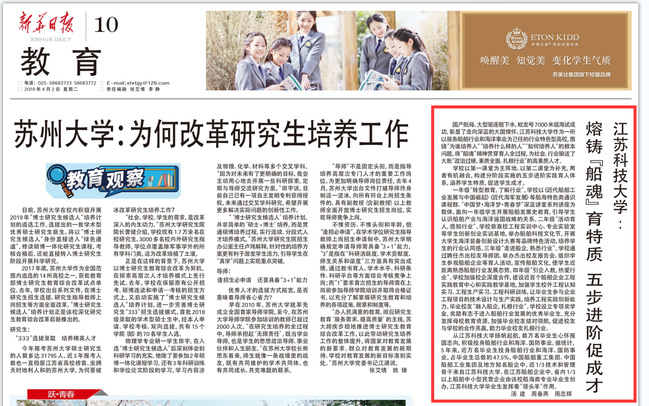 新华日报《米兰网页版页面登录:熔铸“船魂”育特质 五步进阶促成才》(2019年4月2日)
