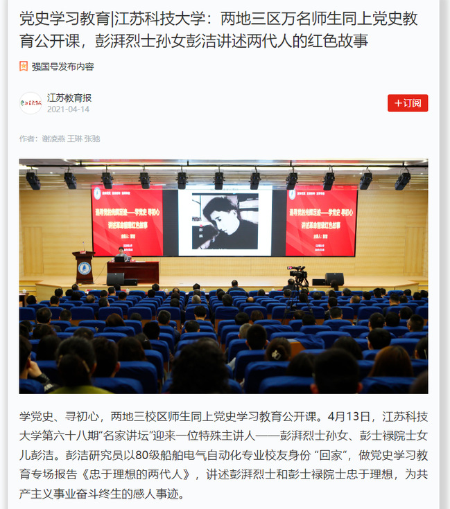 学习强国《党史学习教育|米兰网页版页面登录:两地三区万名师生同上党史学习教育公开课,彭湃烈士孙女彭洁讲述两代人的红色故事》(2021年4月14日)