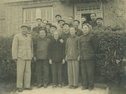 1965年,原国家副主席、时任国务院农垦部部长兼新疆建设兵团司令员王震(第二排左起第二)和蚕研所、新疆建设兵团领导在蚕研所办公楼前合影